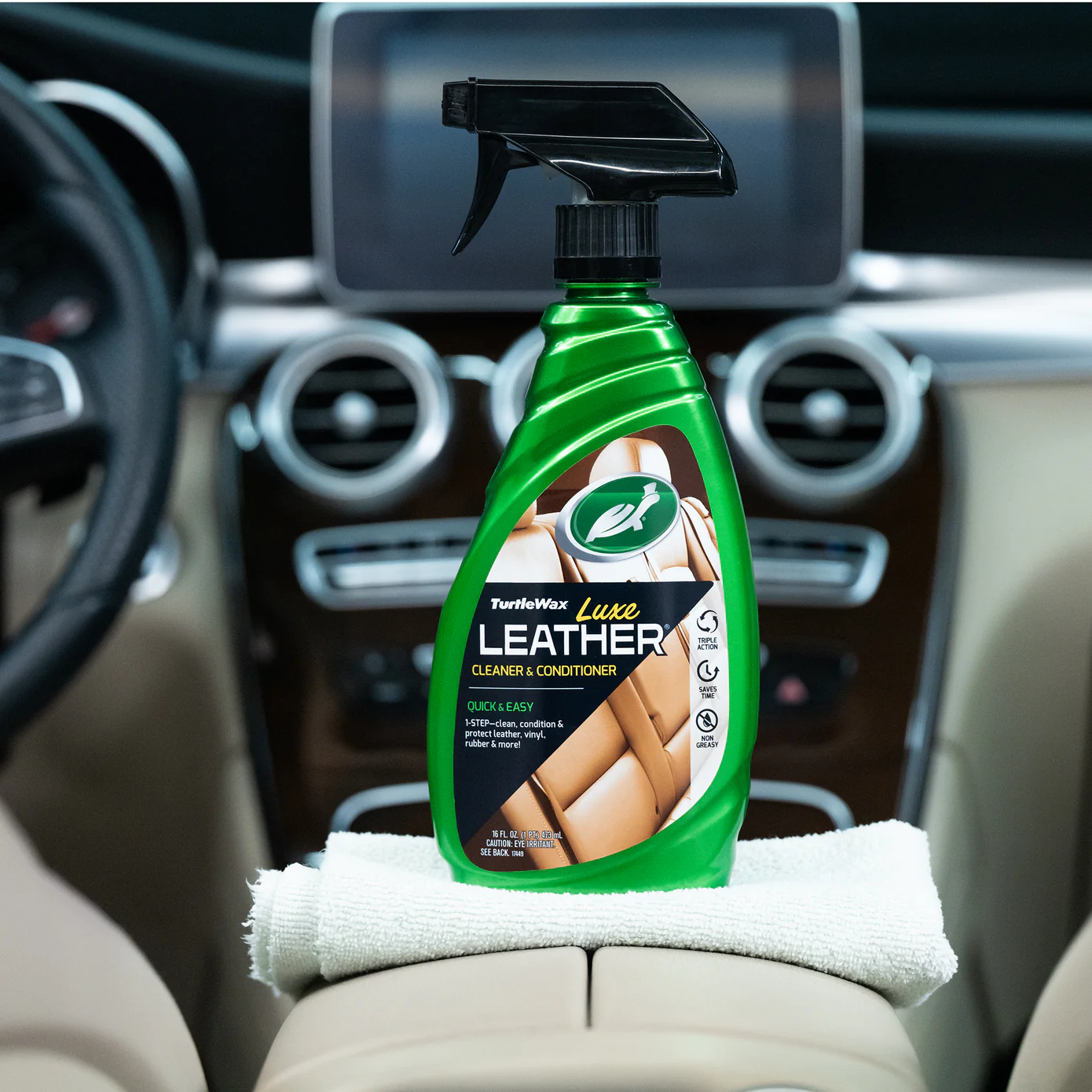 Turtle Wax Luxe Leather Cleaner and Conditioner 473ml is a 1-step product which cleans, conditions and protects Leather, Vinyl, Rubber and more!The quick penetrating formula spreads evenly; its emollient enriched ingredients restore a soft, smooth feel to sun dried leather. Porous, damaged leather surfaces easily absorb the non-greasy, non-oily conditioners and sunscreen ingredients.Turtle Wax Luxe Leather Cleaner & Conditioner contains a scientifically balanced blend of cocoa butter, Vitamin E, and Aloe Vera to nourish the leather. The formula gently softens and helps prevent leather surfaces from cracking caused by the rages of time, wear and over-exposure to the sun’s damaging rays. The formula is pH balanced to be gentle, allow for regular use, and preserve a “natural leather look”. The easy to use formula leaves a smooth, silky, natural feel. It never leaves a tacky, sticky residue like some protectants and soaps.